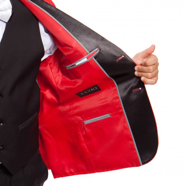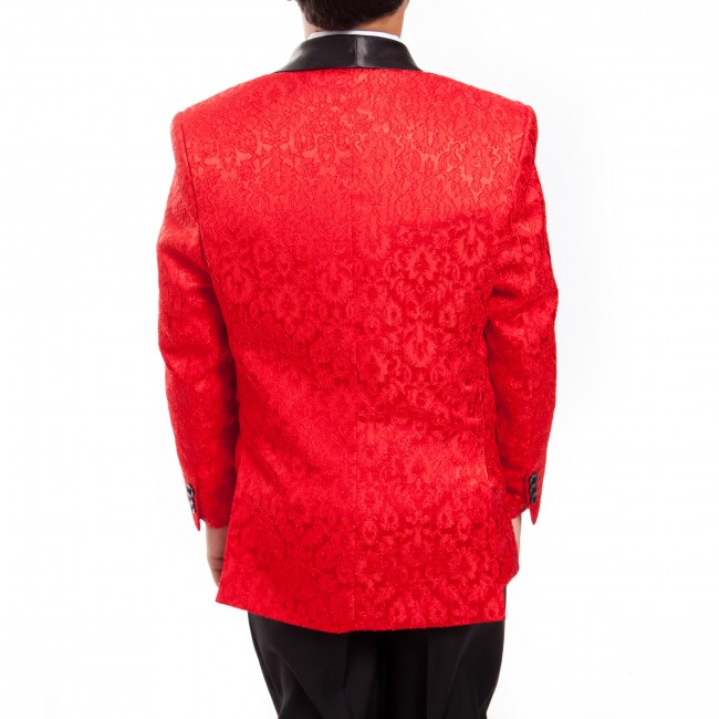 Boys fancy pattern tuxedo 5-piece set. Modern Fit. Set includes: coat, pants, vest, dress shirt, and bow tie. Available in 7 different colors. Available sizes start from toddlers sizes to teens. High quality boys tuxedo. Made of exceptional Poly/Rayon blend fabric (65% polyester, 35% rayon). Perfect for holiday and Christmas season, weddings, parties, or any other formal event. Product should be dry cleaned.