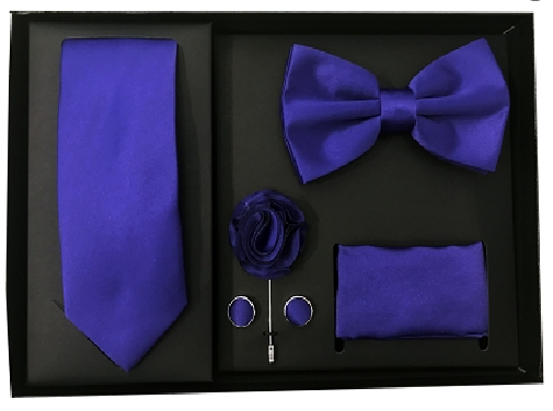 Mens Purple Gift set comes in a Gift Box. Set Includes Adjustable Pre-tied Bow Tie, Self Tie Neck Tie, Lapel Pin, Cuff Links, and a Pocket Handkerchief. Now You Can Get all Your Accessories to Match in One Simple Purchase!This 5 Piece Set is Perfect For Weddings, Parties, or Simply Just Dressing Up! Many Matching Styles, and Colors Available.