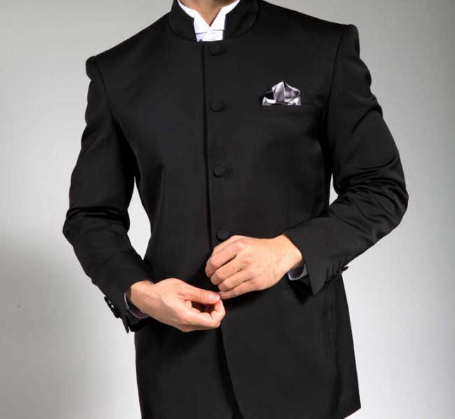 New Black Mandarin Collar, Banded Collar Single breasted 5 button Tuxedo suit. Poly/ Rayon blend.Side vents, single pleat trousers, solid color.Pants are sizes in a 6inch drop and come unhemmed. These are the kind of details that Will last for years and keep in good structure.a Tuxedo truly excellent. This is European and modern. Classic and fashion at its best.We create a unique combination of eastern elements(Nehru Suit, Chinese Collar) and the United States cutting. You will not be too tight while wearing this stylish piece.Will last for years and keep in good structure.