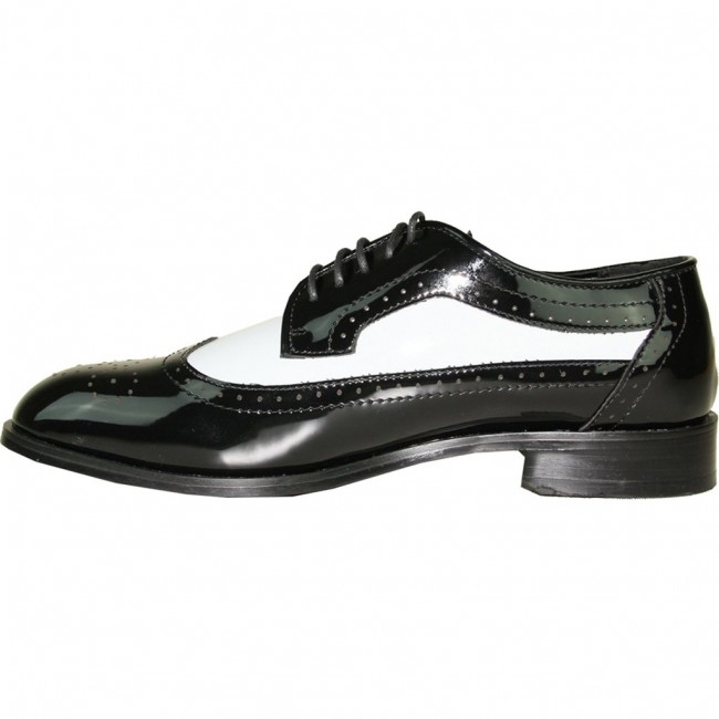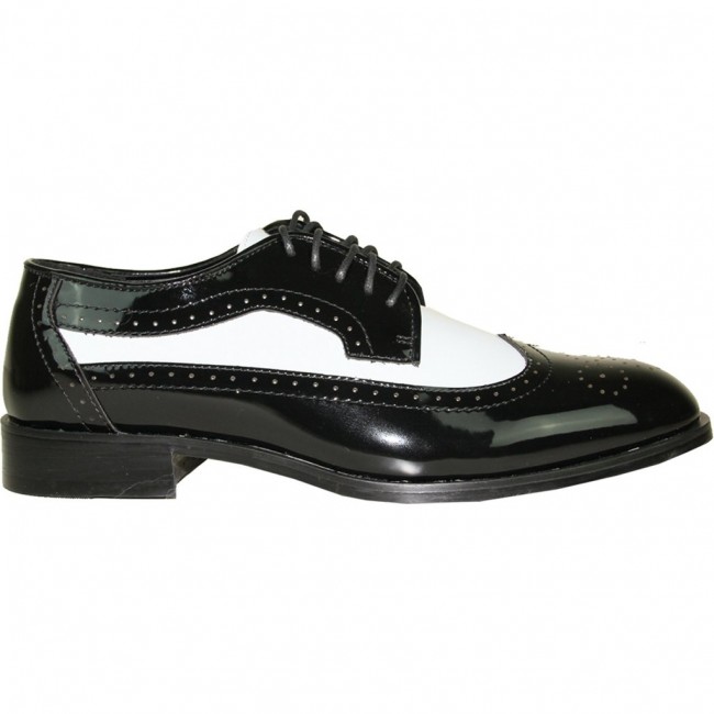 Tuxedo patent leather Mens Black and White lace up shoes by Jean Yves. Very comfortable dress shoes. Although these shoes are not made of leather they are made of a durable man made fabric called PVC. Also known as spats shoes due to the fact that it look like you are wearing spats with it..
