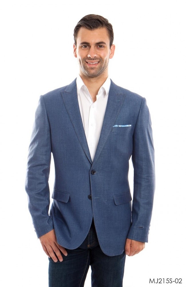 Mens Blue 00% Linen Coat ONLY. Two button Peak Lapel. Slim Fit. Interior Pic-Stitching. Flap Pocket. 1-Chest pocket. Great for the Summer.