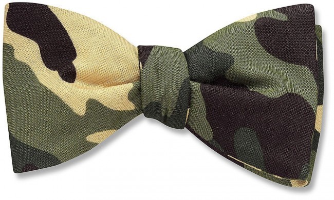 CAMOUFLAGE print polyester pre-tied Bowtie. This a banded adjustable tie which means it has an adjustable band that goes around the neck and clasps under the bow tie. MENS tie measures 2.5 in wide and 4.5 in long, adjusts from 10 in to 19.5 in around the neck.