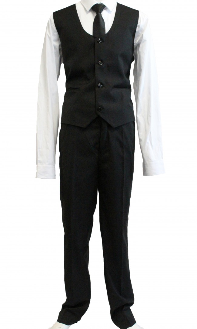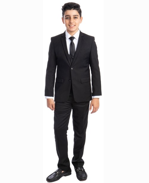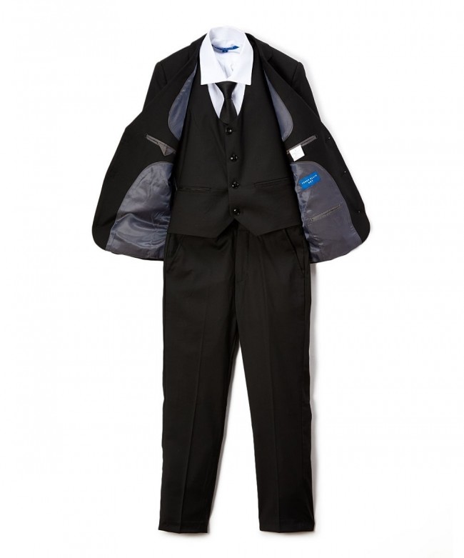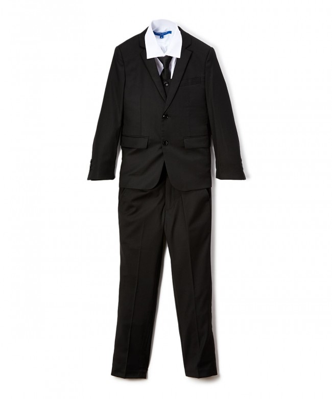 A modern take on a classic suit by Perry Ellis, this 5-piece solid boys suit is great for your next event. A perfect blend of elegance, style and comfort. Jacket - Notch lapel, solid, chest pocket, side flap pockets, inside pockets, two button front closure, Shirt - White button up dress shirt, Tie - Matching tie, Vest - Four button closure, solid pattern, V-neck vest, Pants - Flat front, zip fly, button closure, solid Modern fit