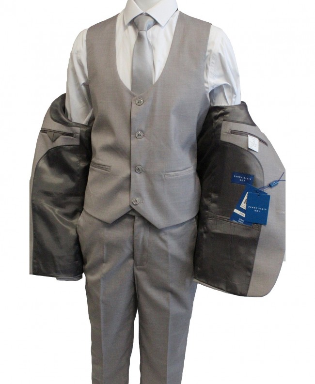 A modern take on a classic suit by Perry Ellis, this 5-piece solid boys suit is great for your next event. A perfect blend of elegance, style and comfort. , Jacket - Notch lapel, solid, chest pocket, side flap pockets, inside pockets, two button front closure, Shirt - White button up dress shirt, Tie - Matching tie, Vest - Four button closure, solid pattern, V-neck vest, Pants - Flat front, zip fly, button closure, solid Modern fit