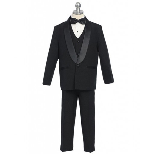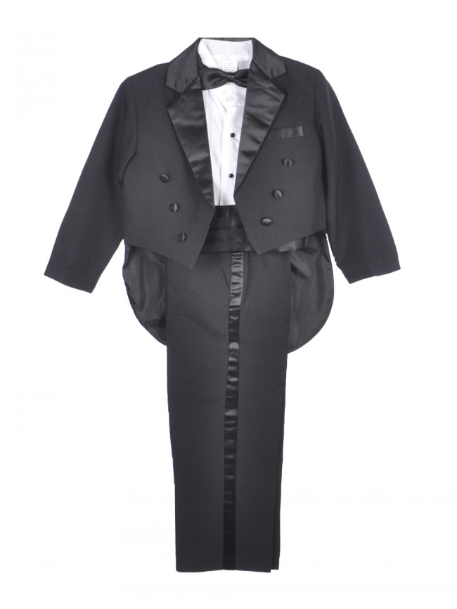 Why rent your child's tuxedo when you can purchase it for less? New Boys BLACK TAIL COAT 5-Piece Tuxedo Set includes black polyester notch lapel tail coat with satin trim and satin covered buttons, matching black polyester lined tuxedo trousers with the satin line on the sides made with adjustable elastic waist, white wing collar tuxedo shirt, black satin vest and bowtie. Available in all sizes Infant 6 months to Teen 20 years old. These are married sets and different size pieces cannot be mix matched, if you need a different color vest and tie, or different color shirt you can purchase separate. Sizes run true to size. Perfect for any Wedding, Prom, Pageant, School Performance or any Special Event that requires formal attire.