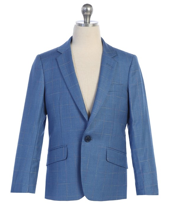 New Boys plaid checker print sports coat. Slim Fit. One button Notch Lapel. Flat pockets. Runs True to size. Comes in Sizes 1-20. Great for Holiday attire or event.