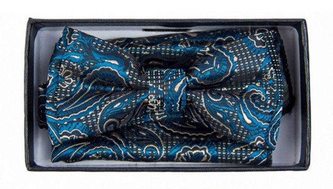 aisley Satin pre-tied Bow tie with matching pocket square. This a banded adjustable tie which means it has an adjustable band that goes around the neck and clasps under the bow tie.Boys tie measures 1.5 in wide and 3 3/4 in long, adjusts from 8 in to 15.5 in around the neck.