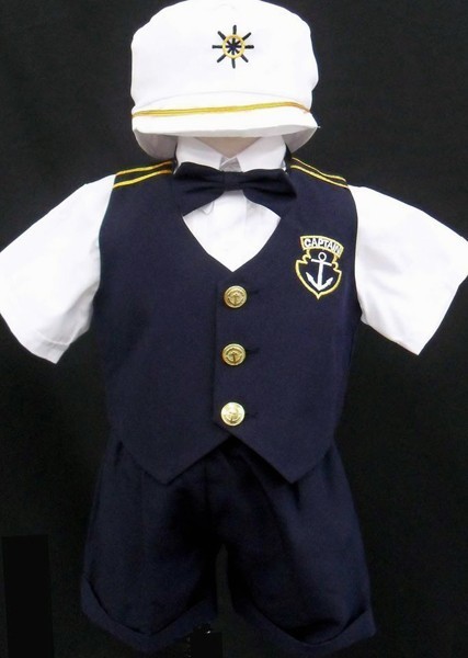 New Boys Shorts and Short Sleeve Navy Blue Sailor Suit Nautical 5-Piece set includes navy blue polyester vest with nautical gold embroidered design and buttons, navy blue polyester shorts and bowtie, white short sleeve dress shirt and gold embroidered white sailor hat.