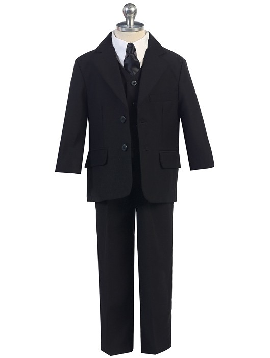 New Boys BLACK 5-Piece Suit Set includes black polyester three button notch lapel suit coat, matching black polyester flat front elastic waist lined suit pants the bigger sizes have belt loops for a belt, white laydown collar shirt, black polyester vest and necktie. Available in all sizes Infants 6 months to Teen 20 years old. These are These are married sets and different size pieces cannot be mix matched, if you need a different color vest and tie, or different color shirt you can purchase separate. Sizes run true to size. Perfect for any Wedding, Prom, Pageant, School Performance or any Special Event that requires formal attire..