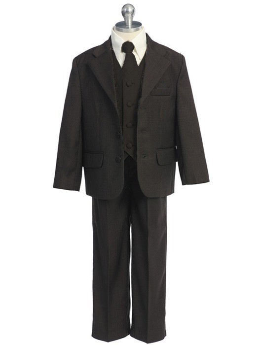 New Boys BROWN 5-Piece Suit Set includes brown polyester three button notch lapel suit coat, matching brown polyester flat front lined suit pants with adjustable elastic waist in the back, the bigger size pants do have belt loops, ivory laydown collar shirt, brown polyester vest and neckti. Available in all sizes Infants 6 months to Teen 20 years old. These are These are married sets and different size pieces cannot be mix matched. Sizes run true to size. Perfect for any Wedding, Prom, Pageant, School Performance or any Special Event that requires formal attire. NO REFUND WILL BE ALLOWED ONLY EXCHANGE.