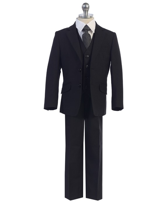 Boys Navy or Black Checkered 5-Piece Suit Set includes Navy or Black checkered two button notch lapel suit coat, matching flat front elastic waist lined suit pants (the bigger sizes have belt loops for a belt), white laydown collar shirt, and matching vest and necktie. Available in sizes 1-20. This suit is made from 65% polyester and 35% viscose, or rather poly rayon. the shirt that comes with this suit is slim fit and comes in all boys sizes made with 80% cotton and 20% polyester microfiber. The matching zip tie to the suit also has the matching color and checker design for a sharp look. Tie color may vary. A poly rayon suit is perfect for summer weddings or any event where you want your boy to have a lighter fabric. These are married sets and different size pieces cannot be mix matched. Affordable, yet great quality that you will always find at TuxedosOnline.com. Get a fantastic high quality formal look for less than the price of large department stores.
