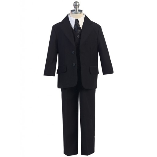 Why rent your child's tuxedo when you can purchase it for less? New Boys BLACK 5-Piece Tuxedo Set includes black polyester two button notch lapel coat with satin trim and satin covered buttons, matching black polyester flat front elastic waist lined tuxedo trousers with the satin line on the sides, the bigger sizes have belt loops for a belt, white laydown collar tuxedo shirt (pictured with wing tip), black satin vest and bowtie. Available in all sizes Infant 6 months to Teen 20 years old. These are married sets and different size pieces cannot be mix matched, if you need a different color vest and tie, or different color shirt you can purchase separate. Sizes run true to size. Perfect for any Wedding, Prom, Pageant, School Performance or any Special Event that requires formal attire.