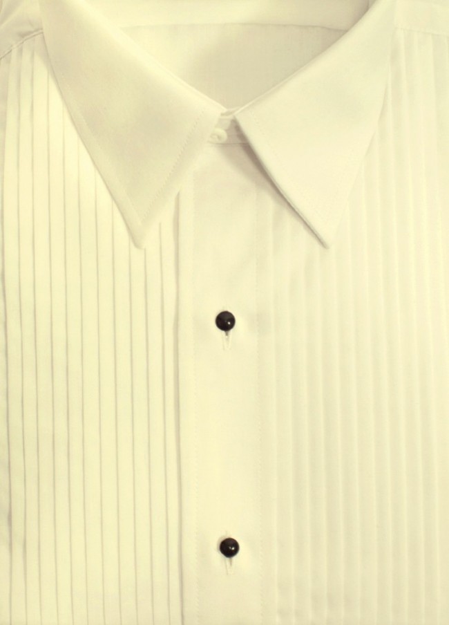 Boys Tuxedo shirt Ivory Laydown collar blend fabric tuxedo shirt with 1/4 inch pleats. Made of 35% cotton and 65% polyester for ease of care. Comes with black plastic removable buttons. This is not a french cuff shirt but does take cuff links. Studs and cufflinks not included. Look and feel your best at any event. Perfect for weddings, proms, or any other formal affair. Available in a wide range of sizes. Affordable, yet great quality that you will always find at TuxedosOnline.com. A fantastic high quality formal look for less than the cost of renting or that of large designer department stores. Specially made to withstand numerous washings and pressings.