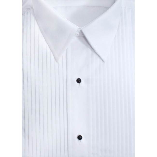 Boys Tuxedo shirt Laydown collar blend fabric tuxedo shirt with 1/4 inch pleats. Made of 35% cotton and 65% polyester for ease of care. This is not a french cuff shirt but does take cufflinks. Comes with black plastic removable buttons. Studs and cufflinks not included. Look and feel your best at any event. Perfect for weddings, proms, or any other formal affair. Available in a wide range of sizes. Affordable, yet great quality that you will always find at TuxedosOnline.com. A fantastic high quality formal look for less than the cost of renting or that of large designer department stores. Specially made to withstand numerous washings and pressings.