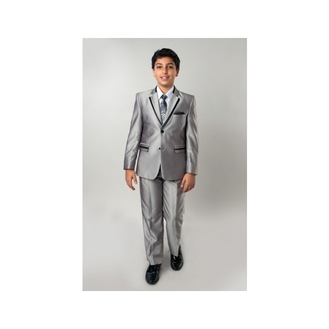 Boys Tuxedo Silver Framed Peak Lapel with Satin Trim. 4-Piece Set. Comes with coat, pants with adjustable elastic waist, shirt, and necktie. Fully lined made of polyester rayon high quality fabric.