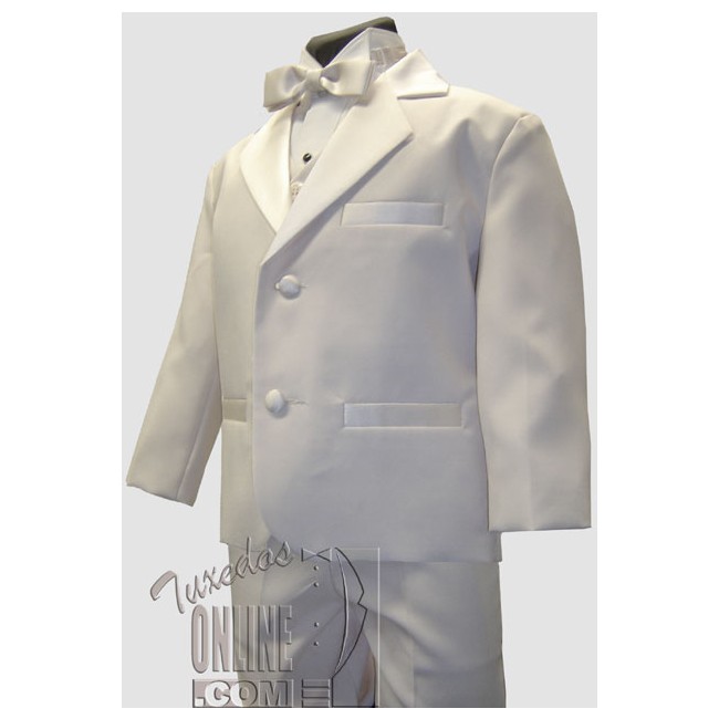 Why rent your child's tuxedo when you can purchase it for less? New Boys WHITE 5- Piece Tuxedo Set includes white polyester two button notch lapel coat with satin trim and satin covered buttons, matching white polyester flat front elastic waist lined tuxedo trousers with the satin line on the sides, the bigger sizes have belt loops for a belt, white wing collar tuxedo shirt, white satin vest and bowtie. Available in all sizes Infant 6 months to Teen 20 years old. These are married sets and different size pieces cannot be mix matched, if you need a different color vest and tie, or different color shirt you can purchase separate. Sizes run true to size. Perfect for any Wedding, Prom, Pageant, School Performance or any Special Event that requires formal attire.¿Por qué alquilar el esmoquin de su hijo cuando se puede comprar por menos? Nuevo Boys BLANCO Juego de Smoking de 5 piezas incluye poliéster blanco de dos botones de corte de la solapa de la muesca con el ajuste de raso y los botones cubiertos de satén, que se ajustan a los pantalones blancos del poliester de la cintura elástico alineados elásticos delanteros con la línea del satén en los lados, cinturón, camisa blanca del smoking del collar del ala, chaleco y bowtie blancos del satén. Disponible en todos los tamaños Infantil 6 meses a Adolescente 20 años. Éstos son sistemas casados ​​y diversos pedazos del tamaño no pueden ser mezcla emparejada, si usted necesita un chaleco y un lazo diferentes del color, o la camisa del color diferente que usted puede comprar por separado. Los tamaños corren fieles al tamaño. Perfeccione para cualquier boda, baile de fin de curso, desfile, funcionamiento de la escuela o cualquier acontecimiento especial que requiera traje formal.