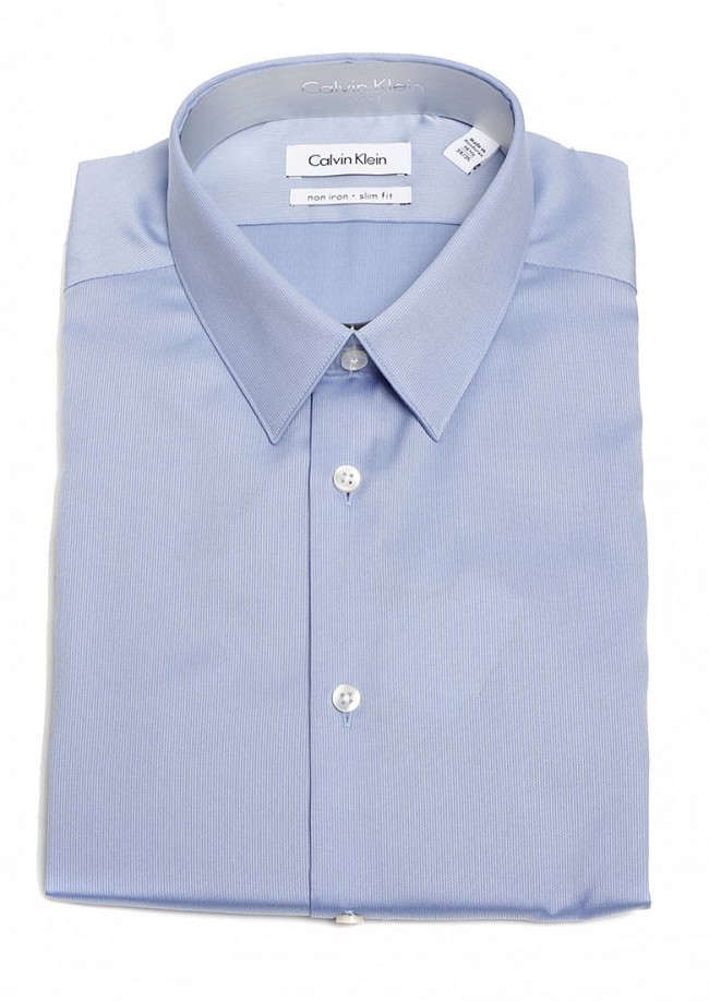Slim Fit Mist Blue Dress Shirt by Calvin Klein. 100% Cotton. Tightly packed tonal stripes texture. Wrinkle-resistant cotton and topped with a sharp point collar and adjustable-button cuffs. Removable collar stays. French placket. Back yoke. Curved hem. Cotton; machine wash. Since its founding, Calvin Klein has been an iconic name, and brand, in the men's apparel industry. Specializing in high end men