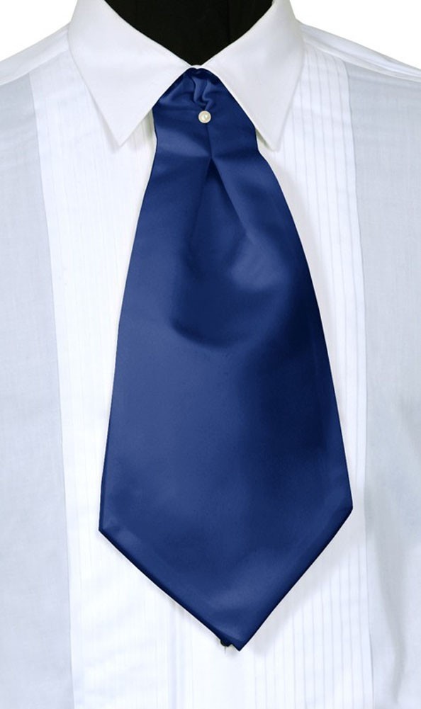 Cravat in Navy Blue for a tuxedo in polyester satin. Comes with a pearl pin that can be replaced with any other tie pin. It is pretied with an adjustable neck band that adjusts for necks from 13 to 22. Can be worn with our matching vests or with a black vest. Can also be worn in place of an Ascot tie.