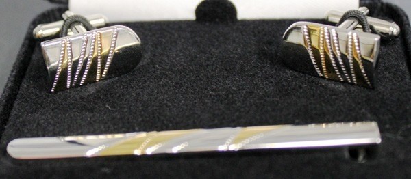Cufflinks And Tie Bar Silver and Gold Set. Comes in a nice velveteen gift box. Great gift for him.