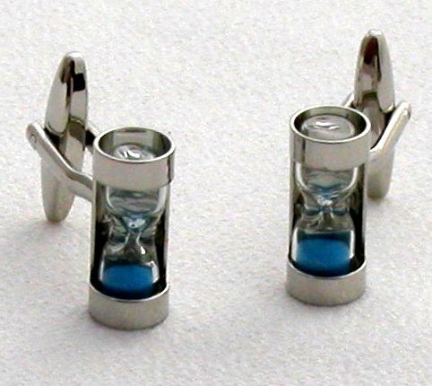 Sands of time in blue, Rhodium hour glass cufflinks. Comes in gift box.