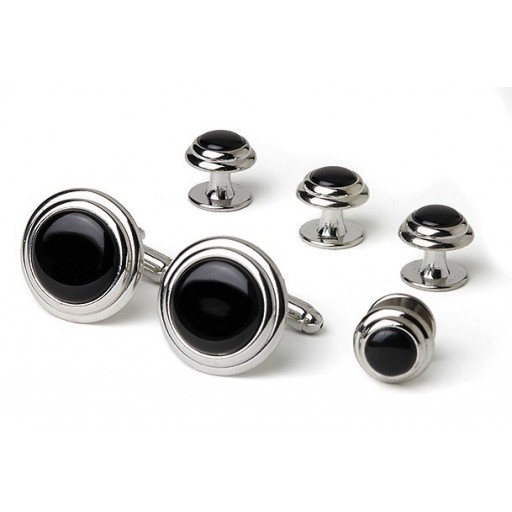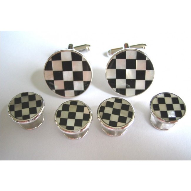 Onyx Mother of Pearl Checker Tuxedo Cufflinks and Studs Set wit a gold or silver rim in a velveteen gift box.