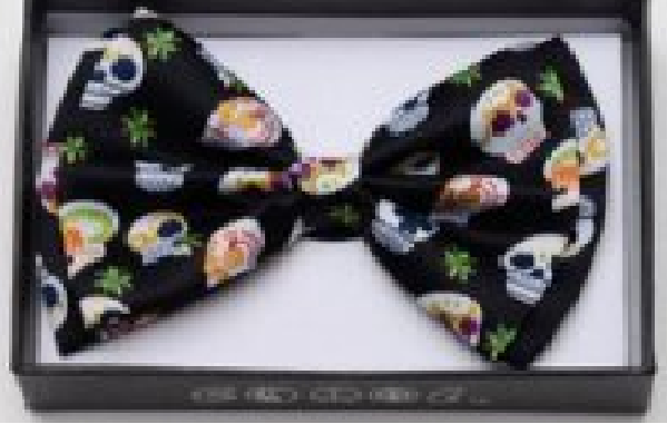 Dia De Los Muertos, Day of the dead Halloween Mens Skull Print bowtie print bow tie for Men. This is a adjustable banded pre tied bow-tie which means it has an adjustable band that goes around the neck and clasps at the back of your neck. Tie measures are 3 in wide and 4.5 in long. Makes a great a affordable bow-tie for Halloween party's and special events. please checkout our Halloween page under shop by event.