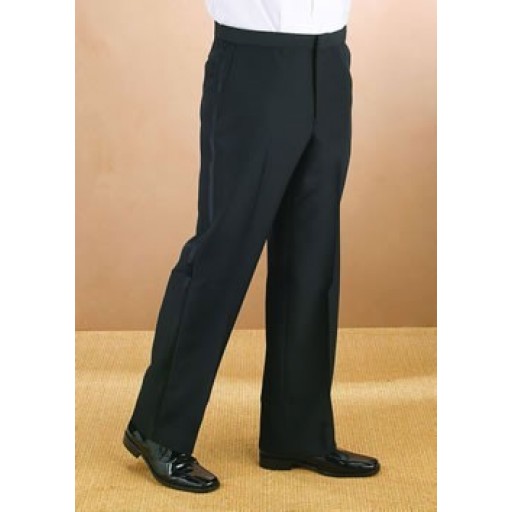 Black dress pants. Tailored fit. 65% Polyester/ 35% Rayon. soft wool feel. Straight through the thigh. Straight leg. No pleats. Non adjustable waist. These pants are great for any event that requires black dress pants like a homcoming dance or for a waiter in a high end restaurant. It is affordable and easy to care for.