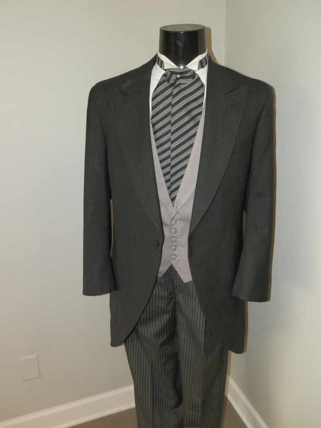 Men's morning coat. Coat only accessories and Pants may be purchase separately. Tropical Worsted Wool Peak Lapel (No Satin) 1 Button Closure Self Top Collar Lined to Waist Double Ply Tail. Traditional Morning" designs haven't changed much since the turn of the century. The classic morning ensemble typically consists of either a Cutaway Jacket (Long), or a Stroller Jacket (Reg), a heather grey vest, hickory stripe trousers and either an ascot or a four in hand tie. When wearing traditional morning attire for a wedding the groom typically wears a cutaway jacket with an ascot tie while the grooms men wear the coordinating stroller jacket and four in hand tie. And best of all, you can purchase this traditional morning attire.