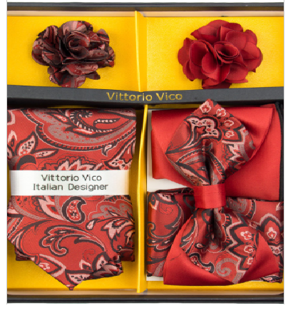 Mens Dual Red Paisley Design Bowtie set,Includes 2 Matching lapel pins, 1Matching Necktie, 1 Matching Bowtie and Pocket Square and 1 Round Hanky 6 piece. Makes a great Gift for Birthdays or Holidays.