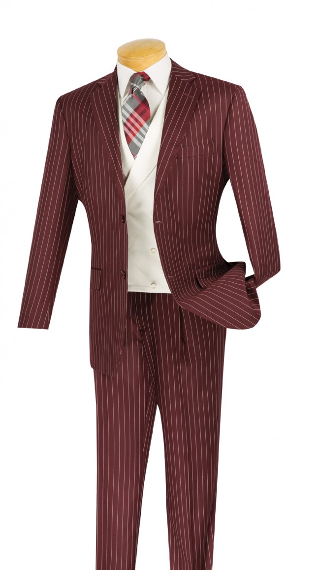 Three-Piece Single Breasted Gangster Stripe Suit has a awesome unique look. The jacket is a single-breasted with two buttons, side vents and notch lapels. A solid white double breasted six button fancy vest. The pant is a single pleated front. The fabric is a luxurious wool-feel gangster stripe pattern poly-rayon blend. Perfect as a church suit and senior prom.