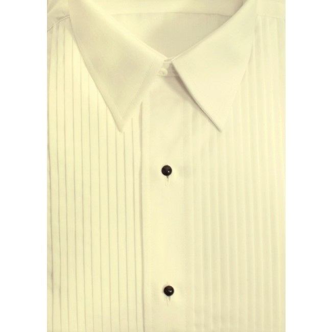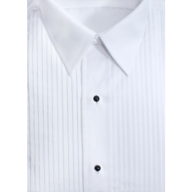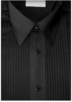 Tuxedo shirt Laydown collar blend fabric tuxedo shirt with 1/4 inch pleats. Made of 35% cotton and 65% polyester for ease of care and wrinkle resistant, wash and wear. This shirt is good quality to wear to a special event like a wedding or prom and it is durable so it can be used as a uniform shirt for waiters and performances. This makes it a wrinkle resistant tuxedo shirt This Shirt comes with black plastic removable studs with regular buttons under them. This way it can be used with studs or buttons if you do not have the studs. This is not a French cuff shirt but does take cuff links. The cuff is a reversible cuff, which means it does not fold over like a French cuff but does have two holes so cufflinks can be used. It also has a button so that it can be button like a regular shirt if you do not have cuff Links. bow tie, and cuff links not included. The studs that are included are plastic. This is a rental quality shirt which means that it is rated for 30 washing and wearing. The collar and cuffs are made of a durable double fussed material. It is ideal for any occasion and is durable easy to care for so it is ideal for use as over and over again. The shirt is wash and wear if you take it out of the dryer and hang. This brand is what is used for the majority of the rental tuxedo industry. Volume discounts are available.