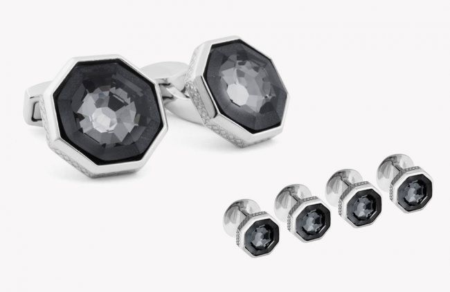 Layered Crystal Cuff Links and Studs Rhodium Plated Set Tateossian