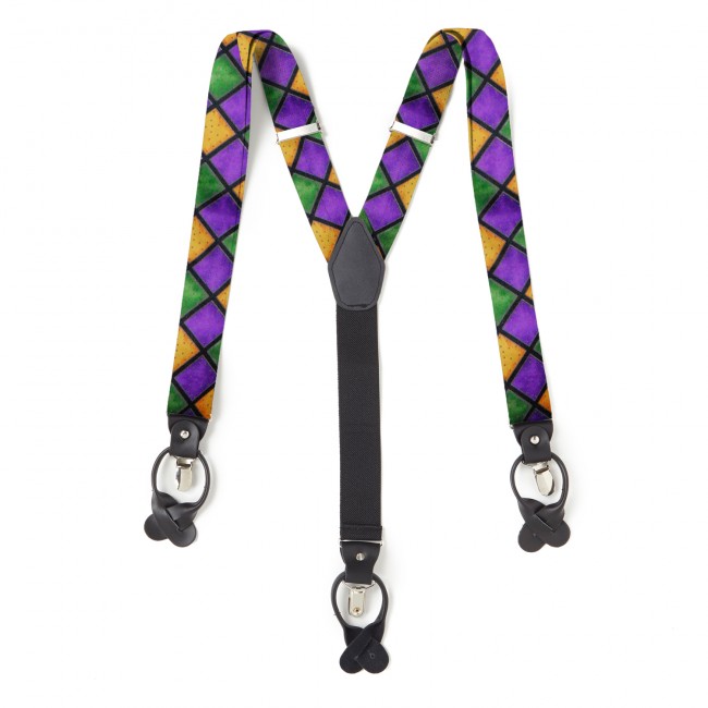 Mens Mardi Gras Design suspenders.Satin Fabric Clip Grip. Adjustable up to 48inch long. Purple, Gold and Green diamond patterned. Once you choose the color and size of the suspenders you will be prompted to add a matching related product. You will get a 20% Discount on the matching item