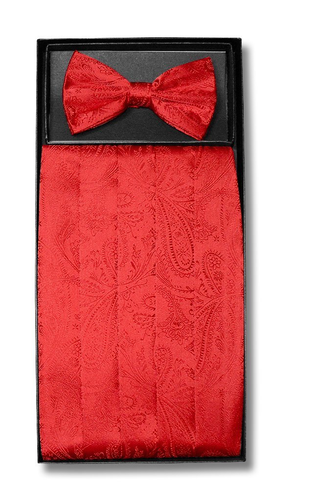 Mens Red Paisley Pattern Cummerbund and Bowtie Set with Self tie Bowtie Option