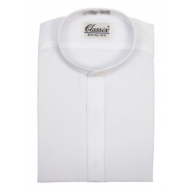 Banded Collar Dress Shirt in made of 65/35 polycotton fabric with front covered placket & convertible cuffs which means they do take cuff links but do not fold over. Has a top fused 1 wide banded collar. Look and feel your best at any event. Perfect for weddings, proms, or any other formal affair. Available in a wide range of sizes. Affordable, yet great quality that you will always find at TuxedosOnline.com. A fantastic high quality formal look for less than the cost of renting or that of large designer department stores. Specially made to withstand numerous washings and pressings.