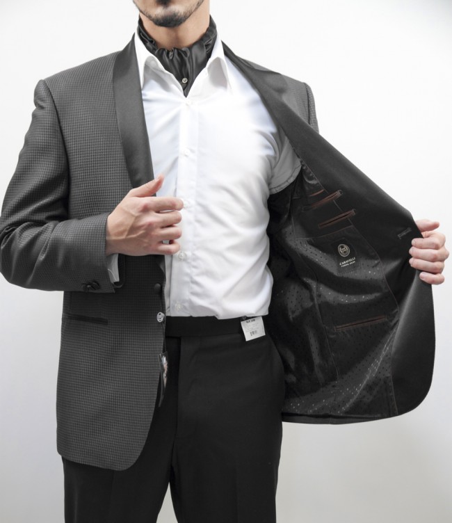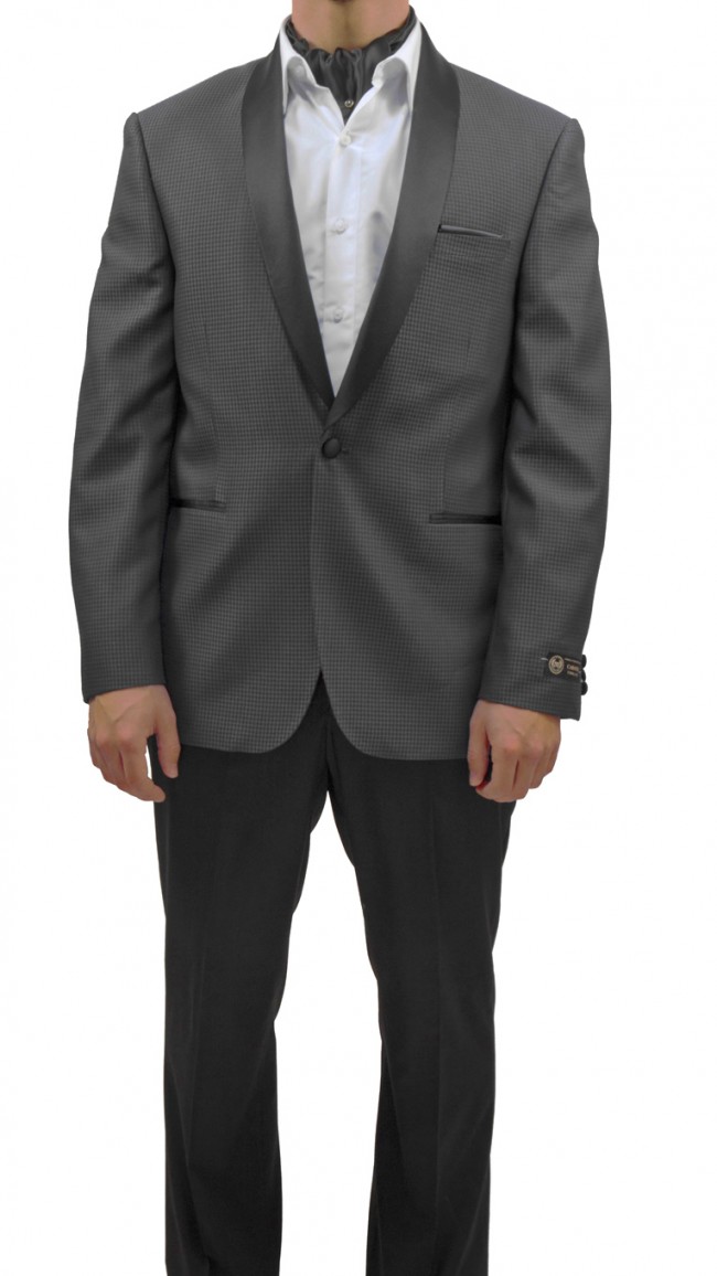 Classic fit two piece tuxedo set is a two button tuxedo with a black shawl lapel, and a diamond pattern checkered down the 150s poly/viscose fabric. Pants come in a 6-inch drop and are non-pleated, and don't come hemmed. Right pants pocket features hidden pocket, and the coat comes with three pockets on the outside of the coat, and five inside pockets. The coat also features stretch armhole panels for ease of movement - a coat that moves with you.