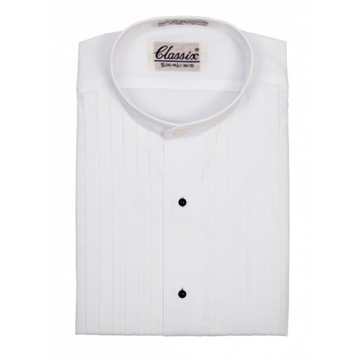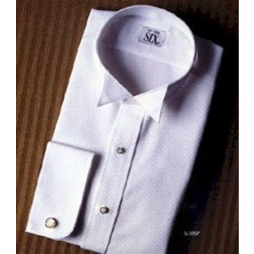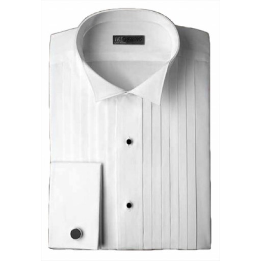 This shirt is a fabric blend of polyester and cotton. The front is pleated by a 1/8th inch, and comes with a black bow tie. The buttons take studs, and basic black studs are included with the shirt. The cuffs of the shirt are french convertible, meaning they can both either be linked by cuff links or buttoned.