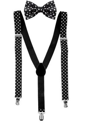 Black and White Polka-Dot Suspenders and Bowtie Mens. Adjustable Y back suspenders with silver finish clips. Pre-tied adjustable bowtie is included with this set bowtie fits up to 24inch neck.