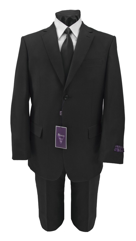 Mens Black Classic Pin Stripe Two Button Notch Suit. Luxurious Wool Feel. Single Breasted, notch lapel with stitch, slim fit, side vents, flat front pants, Poly/Rayon. Pants are a 6 inch drop. Meaning, the waist size is 6 sizes lower then the coat size. For example, if you order a 40R coat you will receive 34 waist trousers.