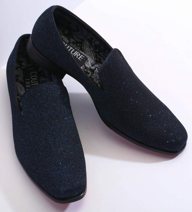 Mens New Glitter Royal Blue Slip on Dress Shoes. Royal Blue Couture 1901 Tuxedo Shoe is a great way to enhance any tuxedo or suited outfit. The Cash shoe is an instantly eye-catching accessory due to the glitter lending it the perfect amount of sheen. The Cash is a great option for dinner dates, dance floors and those dressing to impress.Color: Navy Material: Synthetic/Glitter Style: Slip On Fit & Sizes: 7 to 12 (Regular Width [D])