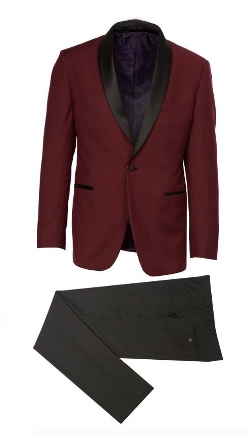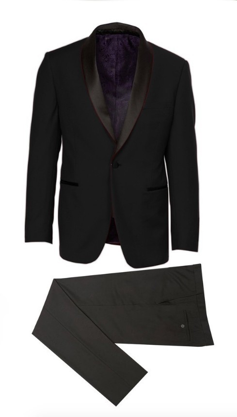 Single button tuxedo with shawl lapel. The coat is a modern fit, which is slimmer than the classic fit, but a more relaxed than a slim fit. There are two side vents in the back of the coat to allow for air flow. This comes as a set with a pair of pants, which do not have a satin stripe going down the sides, and does not have belt loops. On the inside of the coat is a paisley design and there are four inside pockets. The fabric is made of Poly/Viscose 70/30 blend and is meant to resemble a wool fabric, but is much lighter.