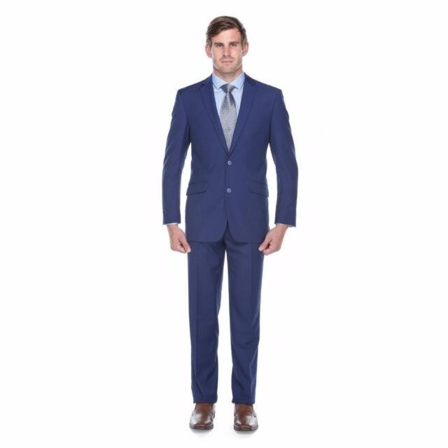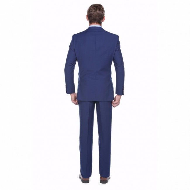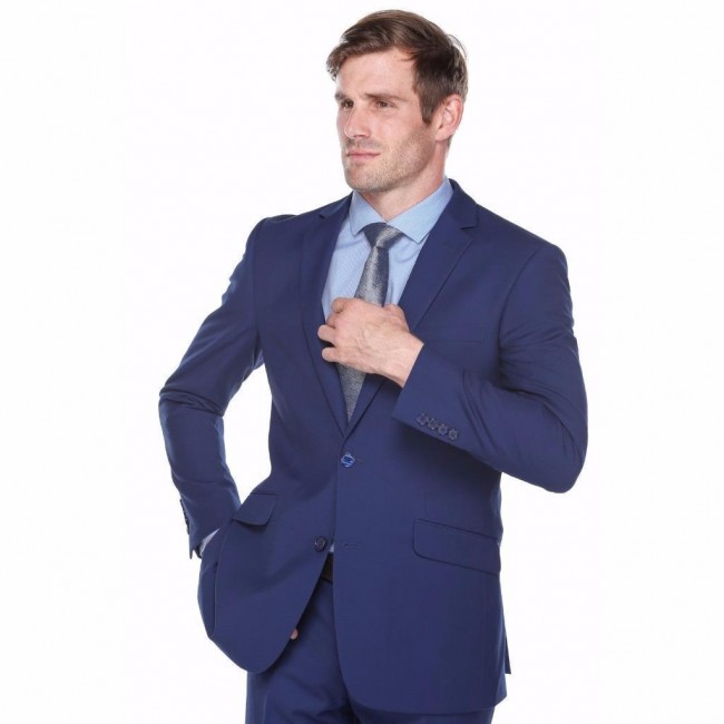Blue suit comes in a bold hue of Blue Made of Poly/Rayon Fabric, a soft blend that is meant to resemble a lighter wool that feels and looks like real wool. The lapel type is a notch lapel, and the suit closes with two buttons. The lapel also features a stitch cut for a flower pin / boutonniere. Pants are the same color and flat-front, meaning they are not pleated. The coat's interior has three pockets, and the trousers' front pocket features a discreet pocket inside. The trousers are unhemmed and come in a 6-inch drop, meaning if your coat size is 42", the waist of the pants will be 34". The suit is a slim fit cut.