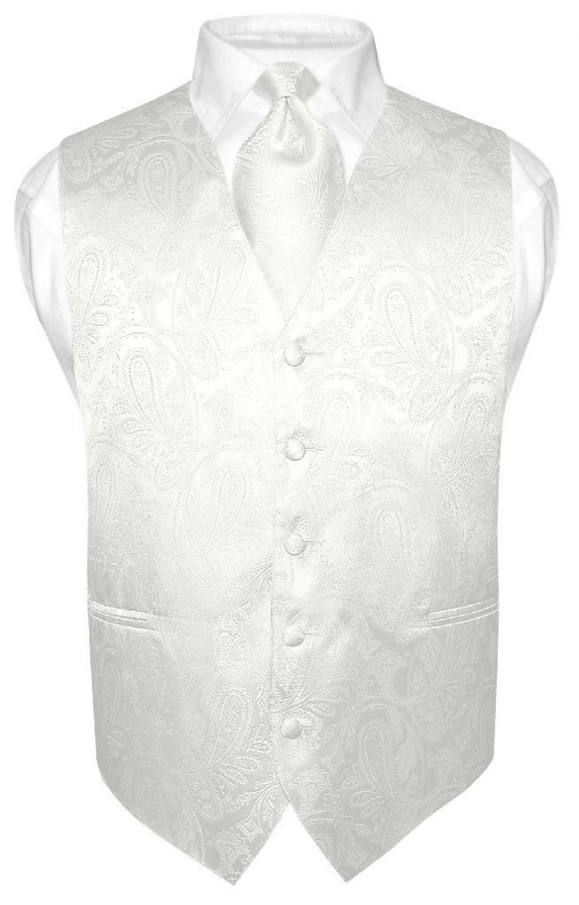 Ivory or Off White Paisley tone on tone Vest with Matching paisley self tie Neck Tie, made from The Same Material For a Perfect Match with belted adjustable back for a perfect fit.Full back vest with five buttons and two real pockets. This vest is Available in our listings in the following sizes: XS (Chest Size: 36), S (Chest Size: 38), M (Chest Size: 40), L (Chest Size: 42) , XL (Chest Size: 44), 2XL (Chest Size: 47), 3XL (Chest Size: 50), and 4XL (Chest Size: 53).