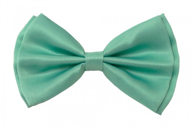 Pastel Mint Green Bow Tie. This is a banded adjustable tie which means it has an adjustable band that goes around the neck and clasps under the bow tie. Tie measures 3 in wide and 4.5 in long, adjustable up to a 24 inch neck and pre-tied to guarantee a perfect knot.