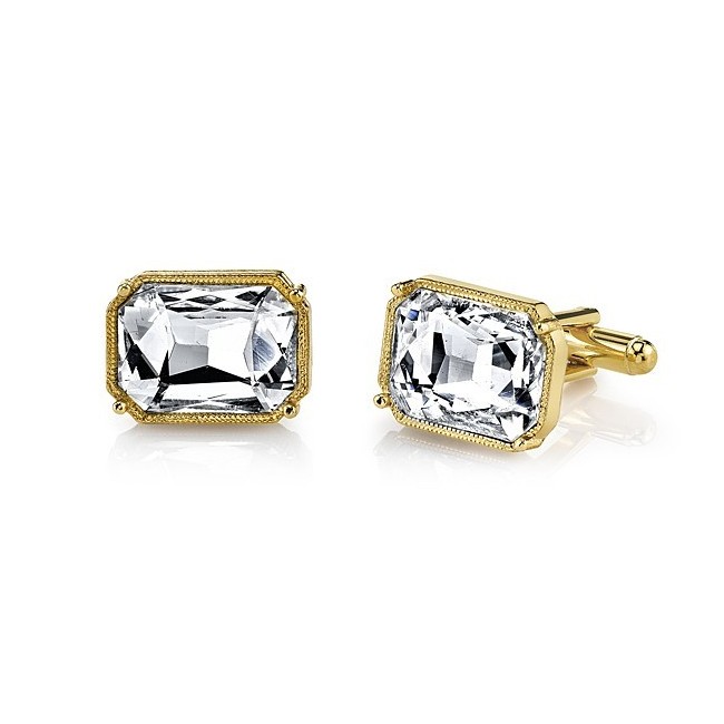 Rectangle Crystal Cuff Links. Comes in a velvet gift box. Gold plated cuff links with the crystal in the middle to give it the diamond look. Cufflinks Measure 12/16 of an inch Length and 10/16 wide.