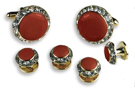 Faux Red Center with Crystal Edge in Gold Setting. Comes in Velveteen gift box. These cuff-links have a swivel back and the studs have a round back.