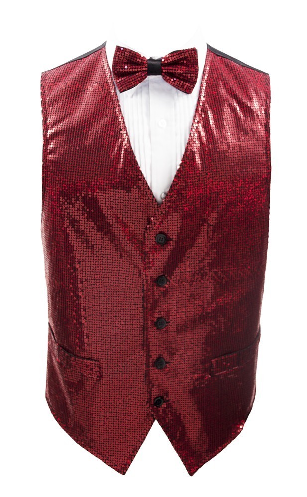 Sequin Vest and Matching Bowtie. Full back, five buttons adjustable vest with two real pockets. The lining and back are black. Vest has an adjustable strap on the back. Perfect for holiday events or any other formal affair. Affordable, yet great quality that you will always find at TuxedosOnline.com. get a fantastic high quality formal look for less than the cost of renting or that of large designer department stores.