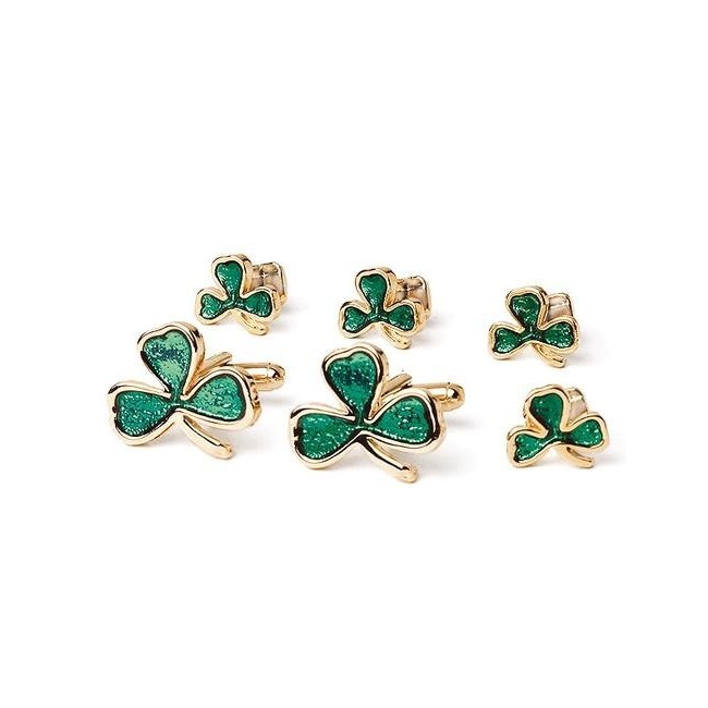 Shamrock emerald green lucky clover Cufflinks and Studs Set in SILVER or GOLD. Painted green perfect for St. Patrick's day. Made of a metal alloy and gold or silver plated and Comes in gift box.