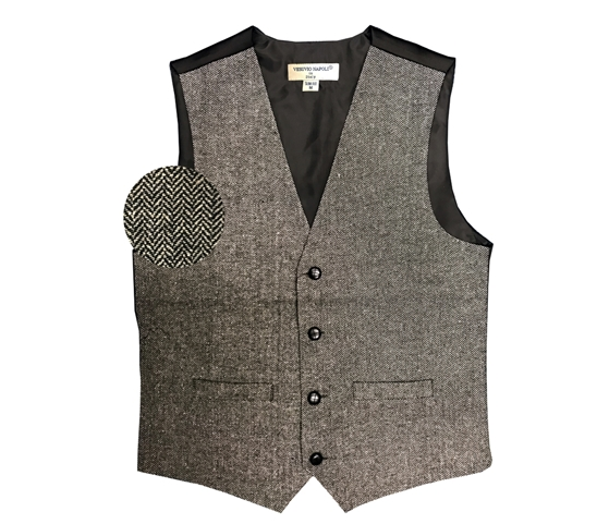 New Black and Grey Mens rustic style slim fit vest. Made of Wool, Viscose, Poly blend. Four buttons inner pocket adjustable back with tweed chevron design.