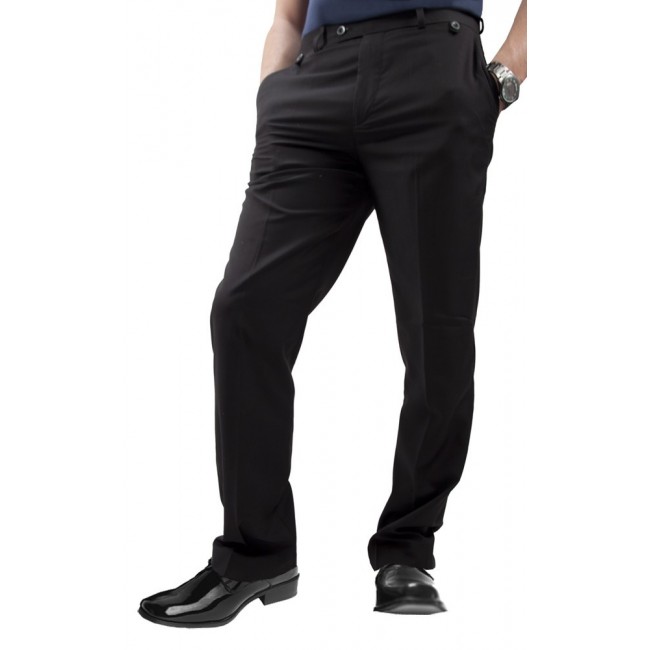 Black Microfiber Dress Pants with Taylored fit. They are straight through the thigh, and a straight leg opening. Fade resistant. Machine wash cold on a gentle cycle using non-chlorine bleach, and dry-clean for best results. Warm iron if needed.;The fabric is 65/35 Poly / Rayon, high quality microfiber material, meaning they look and feel like 100s wool.